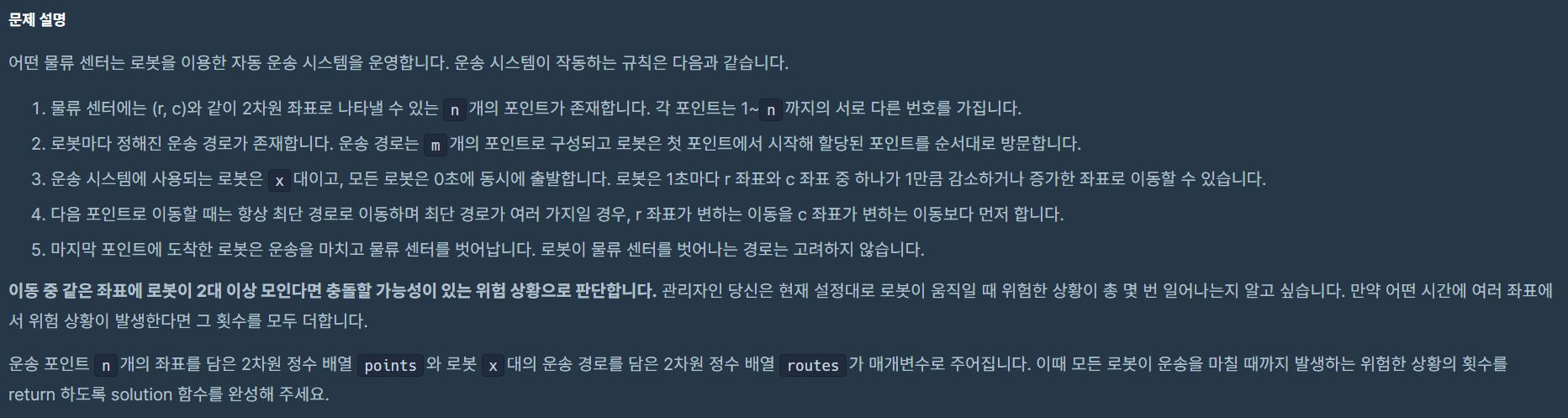 충돌 위험 좌표 개수 세는 로직 구현하는 데 시간이 조금 오래 걸렸다.