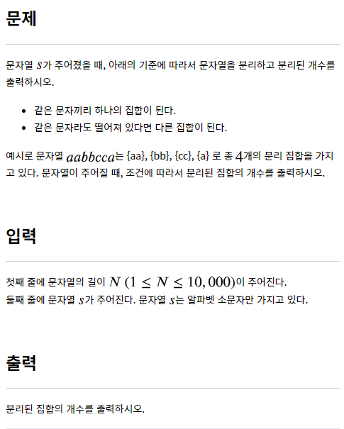 범위 기반 for문을 활용하여 문자열을 순회하면서 가장 최근에 저장된 문자와 비교하며 다를 때는 현재 문자로 갱신하며 cnt + 1, 같을 때는 continue