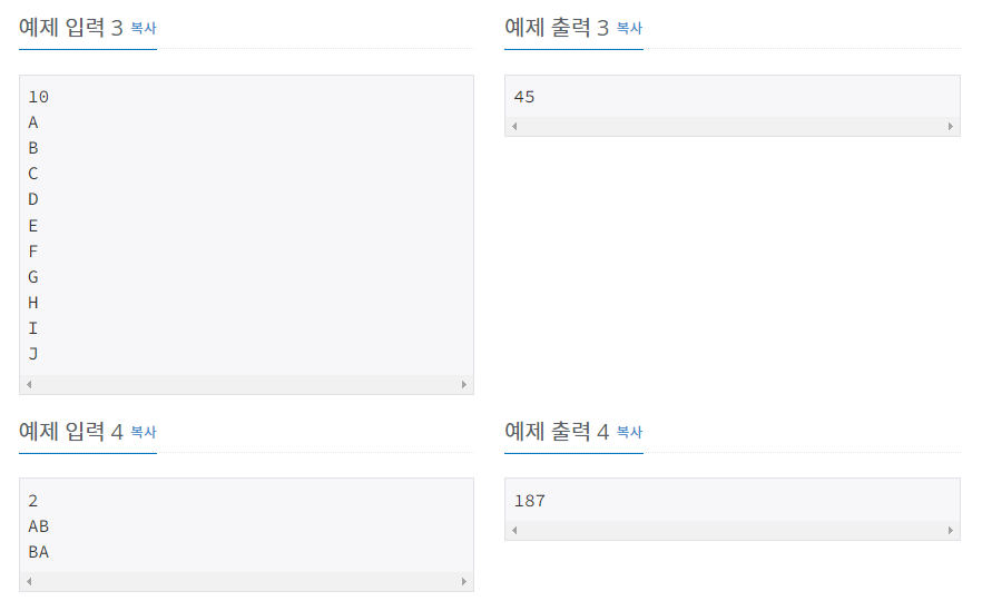 주어진 문자들 중에서 가장 큰 자릿수를 가진 문자가 가장 큰 수를 부여받고, 그 다음 큰 자릿수를 가진 문자가 그 다음 큰 수를 부여받고.... 이런 순으로 주어진 모든 문자에 숫자가 할당되면 이를 더하고 값을 출력한다.