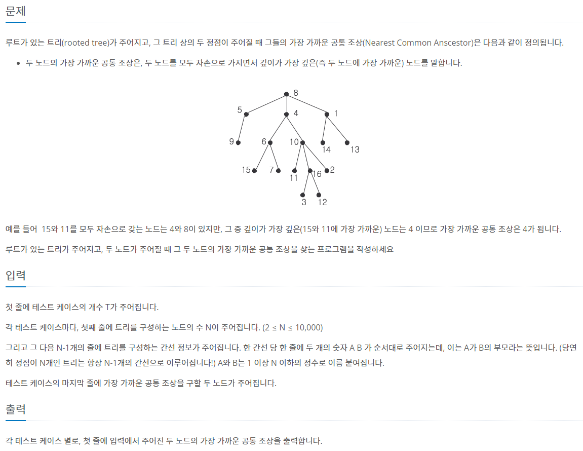 마지막으로 두 번째 노드의 모든 조상 노드를 A에 삽입하는데, 이 때 A에 이미 존재하는 값이라면 이것이 두 노드의 공통 조상 노드이므로 그 값을 출력하고 배열과 vector를 초기화하고 다음 테스트케이스를 진행한다.